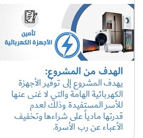 يهدف المشروع الى توفير الاجهزة الكهربائية الهامة والتي لاغنى عنها للاسر المستفيدة وذلك لعدم قدرتها ماديا .